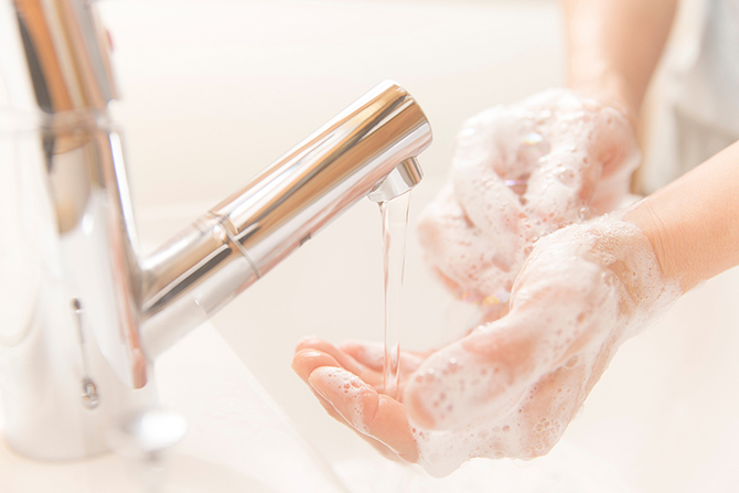 手洗いは、石けんを使って30秒程度かけて行いましょう。手洗いの後にアルコール消毒を加えると、さらに効果的です。
