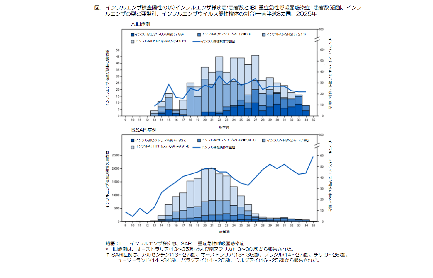- ILI症例のうち68%がオーストラリア、32%が南アフリカから報告され、SARI症例の大半(約68%)はブラジルからの報告であった。