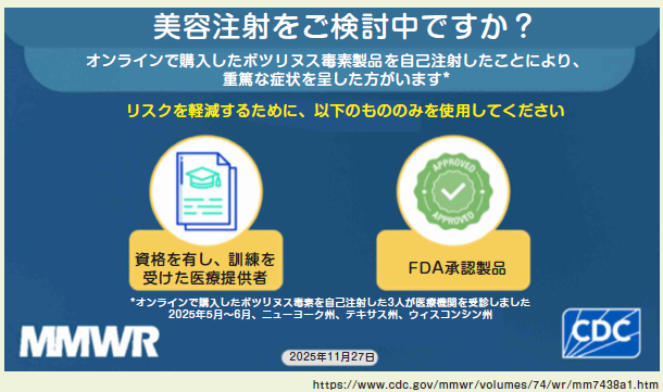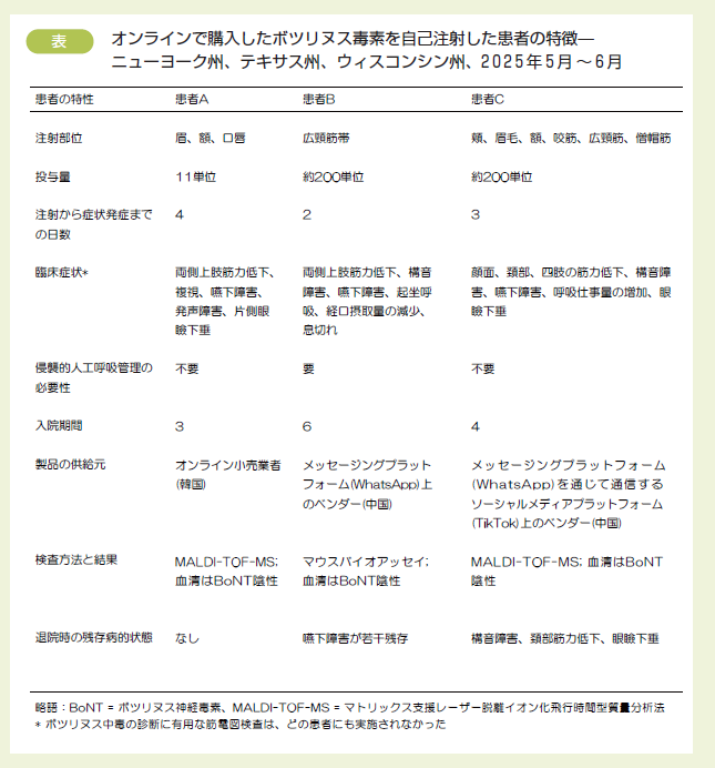 - 本報告は、2025年5〜6月にオンラインで購入した美容用BoNTを自己注射した後、重症化して入院治療を要した3人(ニューヨーク州、テキサス州、ウィスコンシン州 各1人)の経過をまとめたものである。