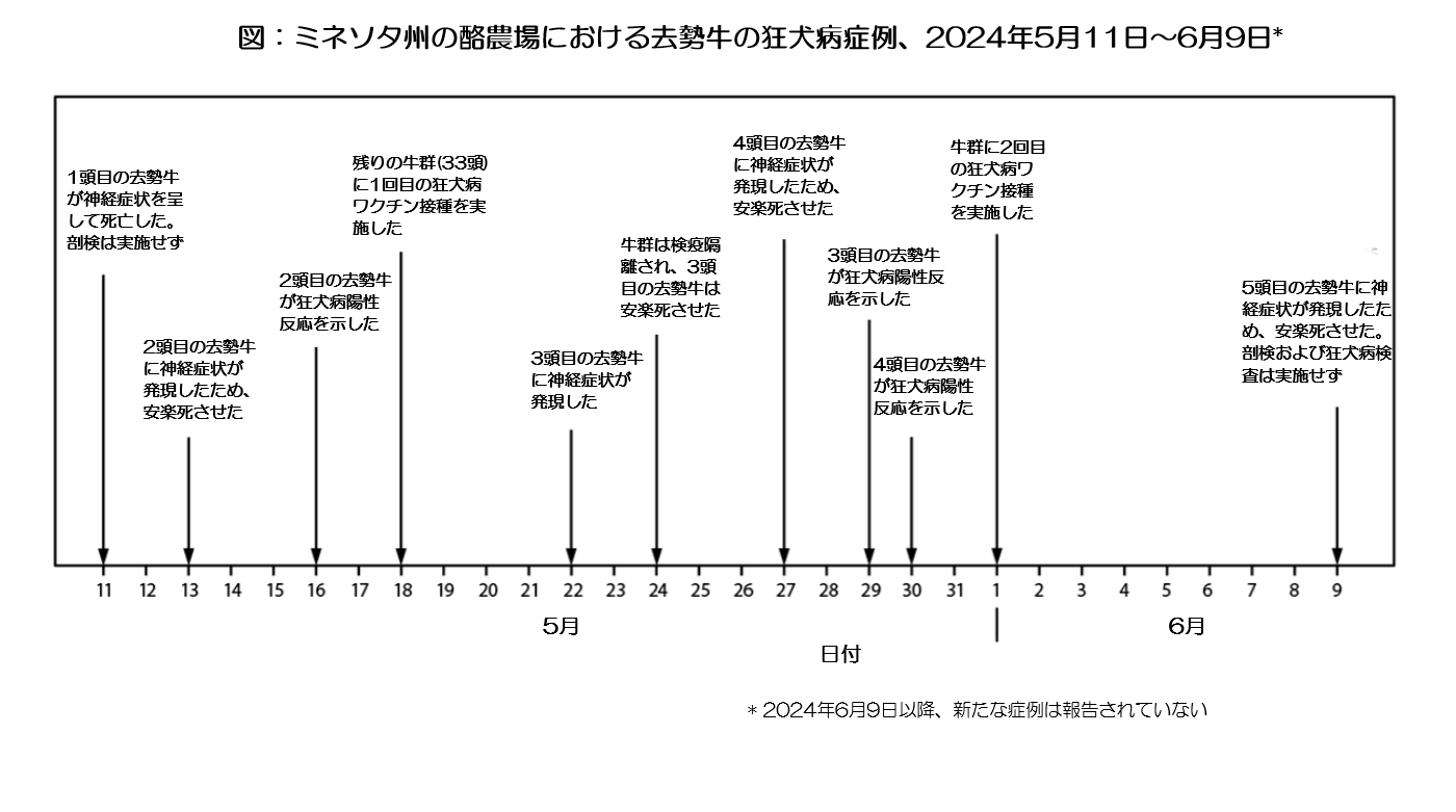 - 2024年5月、ミネソタ州の乳牛飼育場において、35頭の去勢牛のうち5頭が狂犬病と一致する神経症状を呈した。