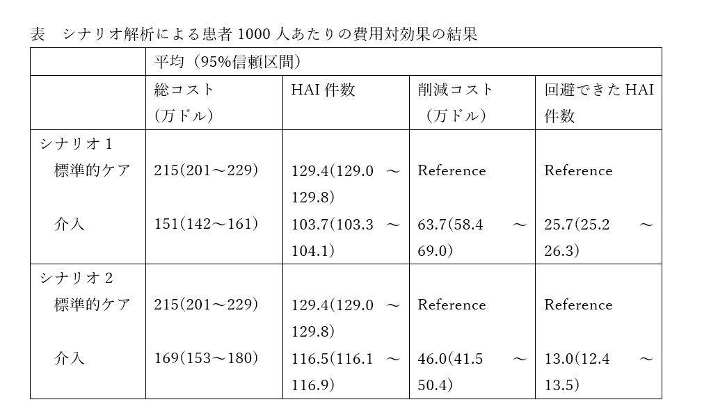 本論文は、以前に紹介した共用医療機器・器具の強化清掃・消毒によるHAIの減少を示した論文の二次解析であり、費用対効果を検証したものである。その結果、強化清掃・消毒を行う費用を上回るHAIの減少が見られ、結果として費用対効果に優れているとしている。表で示したシナリオ1と2は介入の強度の違いで、シナリオ1の方が環境に対してより拭き取り作用の強いワイプを使用するなど、より厳格で強力な介入を行っている。強力な介入には費用がより多く発生するが、それを上回るHAI減少効果があると解釈できる。