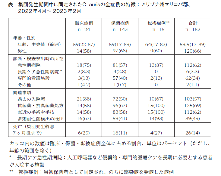 アリゾナ州マリコパ郡で発生した、医療関連のカンジダ・アウリス(Candida auris)による初の集団感染について記述する。また、感染拡大を阻止し、影響を受けた医療施設およびC. aurisを保菌している接触者を特定するために、マリコパ郡公衆衛生局(MCDPH)が実施した対応策の概要を説明する。