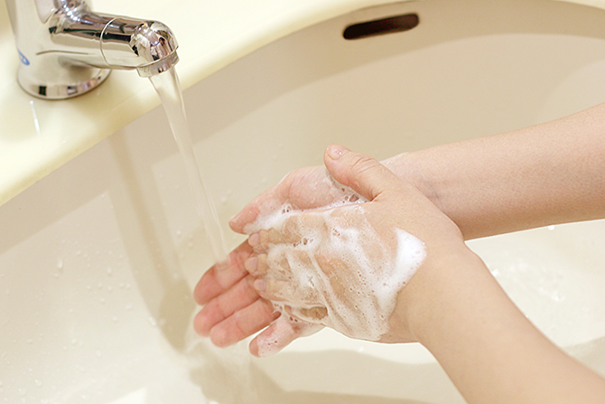 手洗いを徹底し、酸性アルコールで手指を消毒する